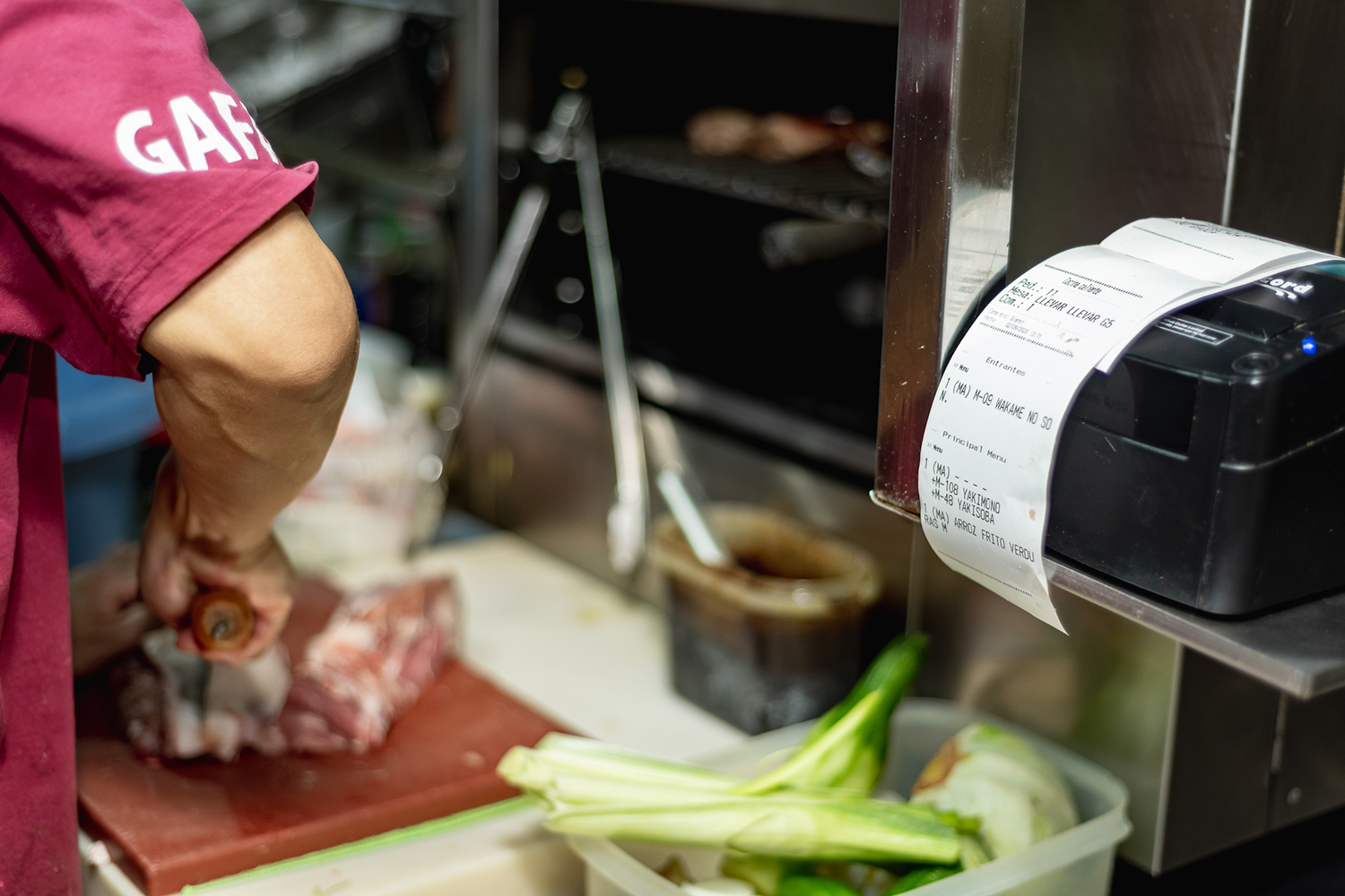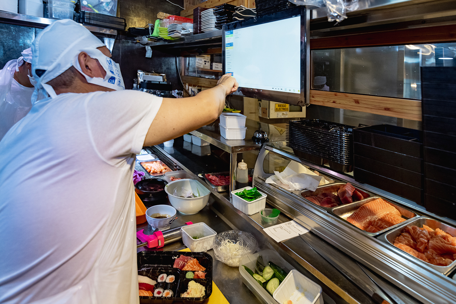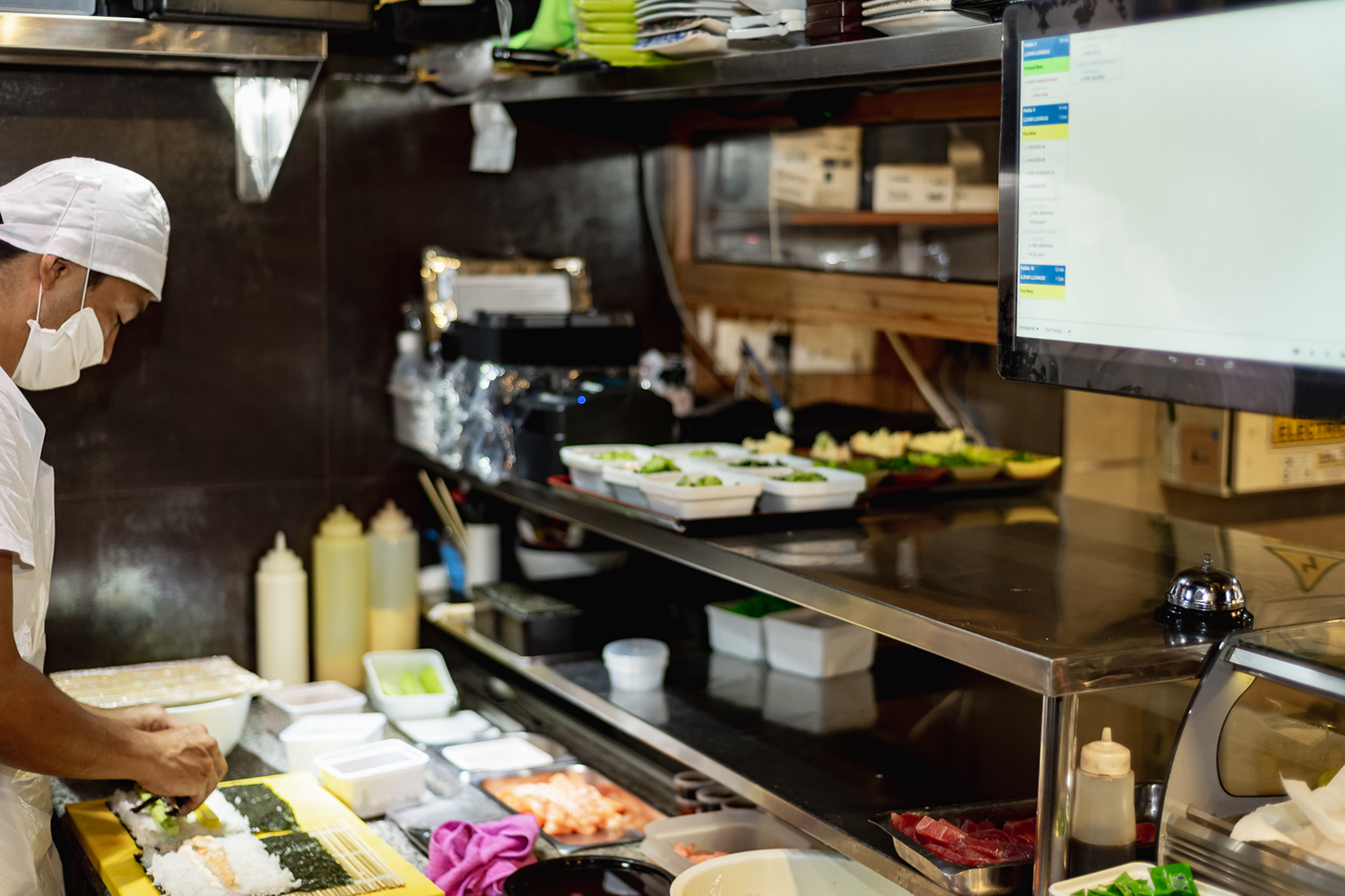 - La cocina se equipa con dos monitores de preparación y varias impresoras térmicas Concord. Los monitores interactivos muestran las comandas en las zonas de preparación sushi y barra indicando el tiempo que lleva pedida cada una, y permitiendo al cocinero ir tachando en la misma pantalla los productos preparados.